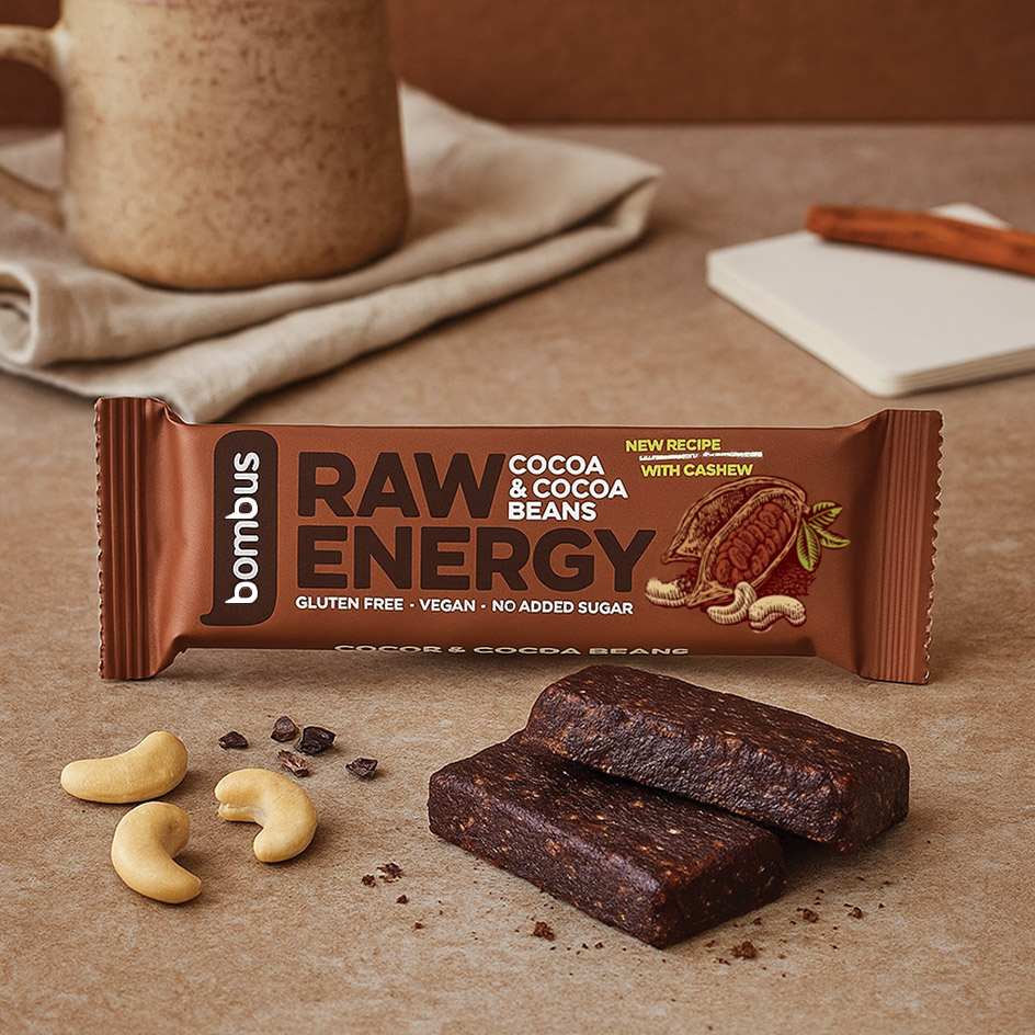 Bombus Raw Energy Cocoa & Cocoa Beans Barrita Crua à Base de Tâmaras e Cajus com Cacau e Grãos de Cacau 50g