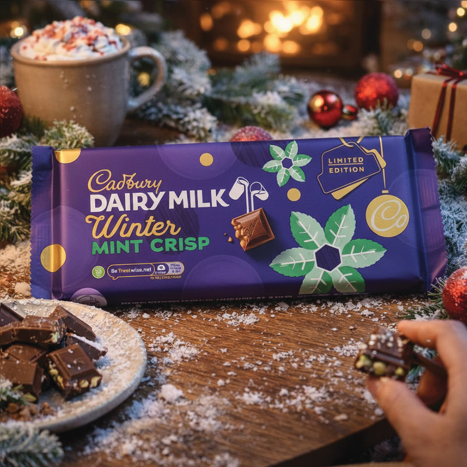 - Tablete de chocolate de leite Cadbury com pedaços crocantes aromatizados a menta, pensada para o inverno.