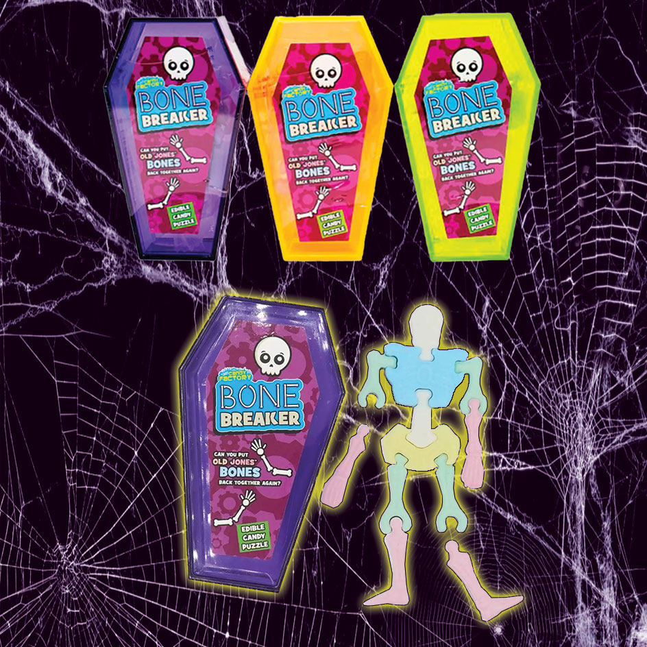 Crazy Candy Factory Bone Breakers Caixão Colorido* com Rebuçados de Sabor a Frutas com Formas de Esqueleto Montável Perfeito para o Halloween 25g (*Existem 3 Cores Diferentes)