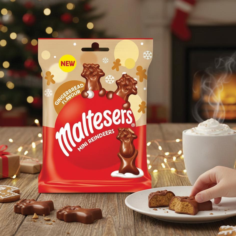 - Chocolate Maltesers com sabor a gengibre, mistura de crocância e especiarias natalícias.