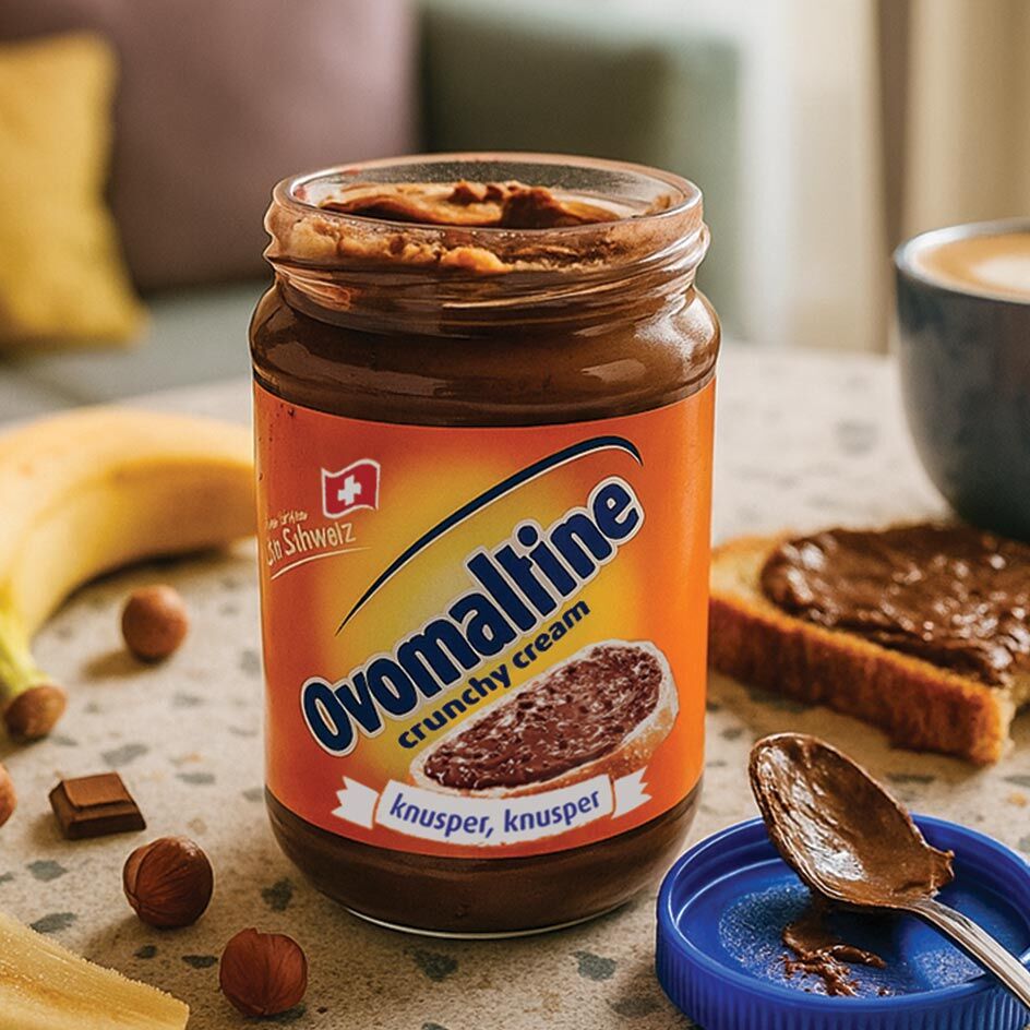 Ingredientes: bebida maltada em pó Ovomaltine (33%) [extrato de malte de cevada (17%), soro de leite condensado, cacau em pó com teor de gordura reduzido, açúcar, frutose, minerais (carbonato de magnésio, fosfato dicálcico), óleo de colza (0,2%), vitaminas (E , C, tiamina, riboflavina, niacina, B6, ácido fólico, B12, biotina, ácido pantoténico), sal, aromas (vanilina), açúcar, óleos vegetais suíços (29%) [óleo de colza, óleo de colza totalmente hidrogenado), avelãs , emulsionantes (lecitina de girassol), mono e diglicéridos de ácidos gordos], minerais (fosfato dicálcico), cacau em pó com teor de gordura reduzido, antioxidante (L-ascorbil, alfa-tocoferol), aromas (vanilina). Alergénios: avelã, cevada e leite. Contém lactose. Pode conter vestígios de amêndoa, caju e soja.