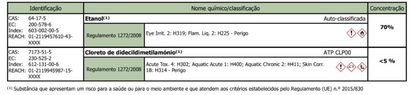 Ingredientes: líquido desinfetante com 70% álcool e <5% de cloreto de didecildimetilamónio.