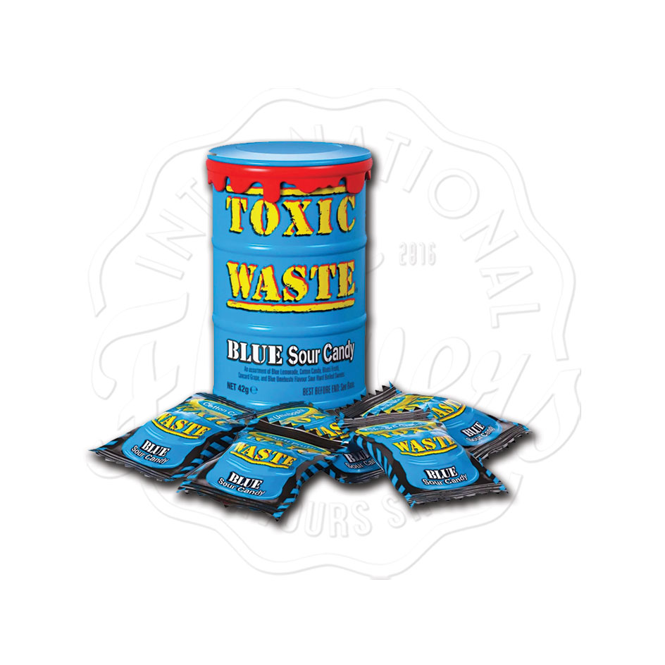 Toxic Waste Blue Sour Candy Drum Sortido de Rebuçados Mega Ácidos com Sabores a Limonada Azul, Algodão Doce, Blutti Frutti, Uva e Ameixa Japonesa Umeboshi 42g